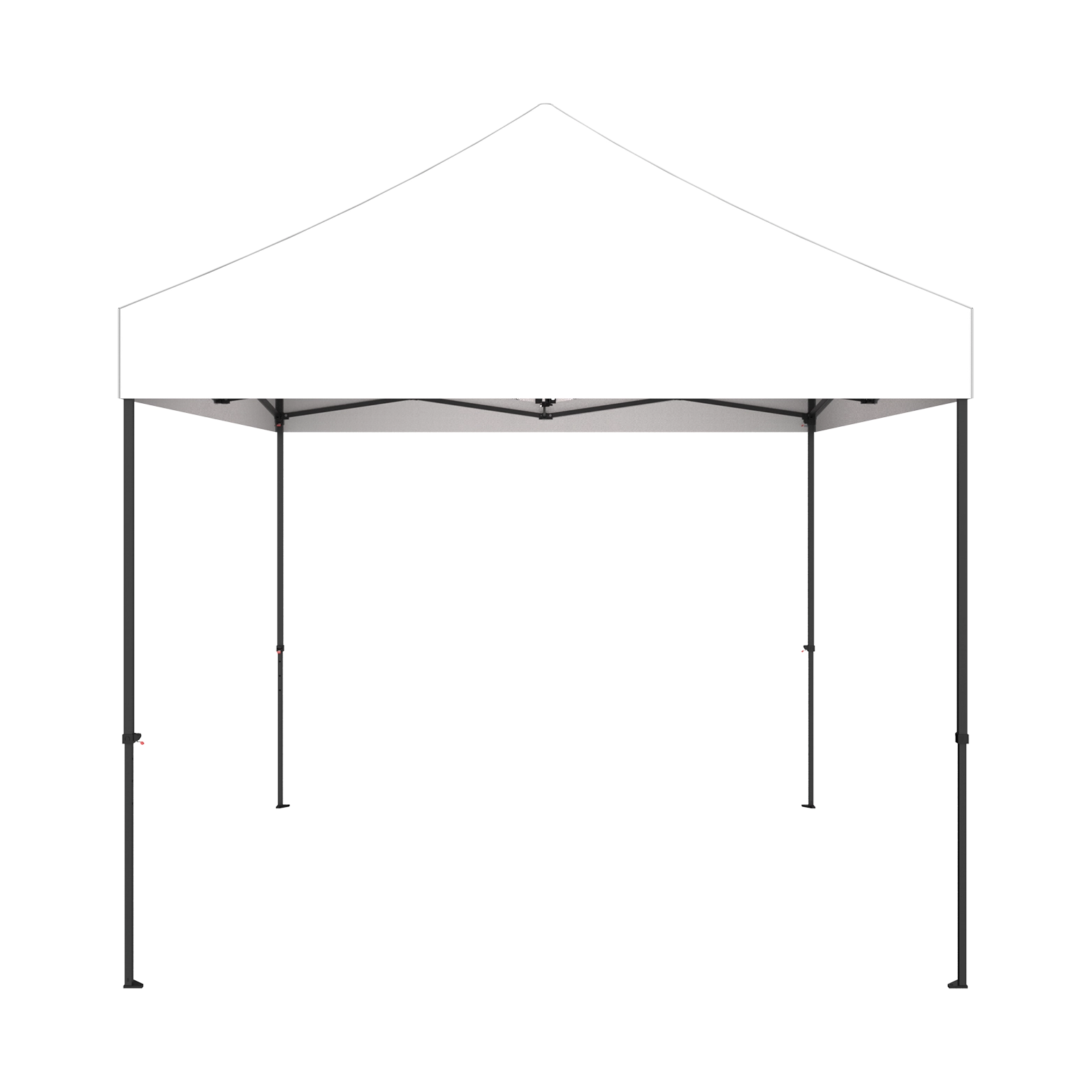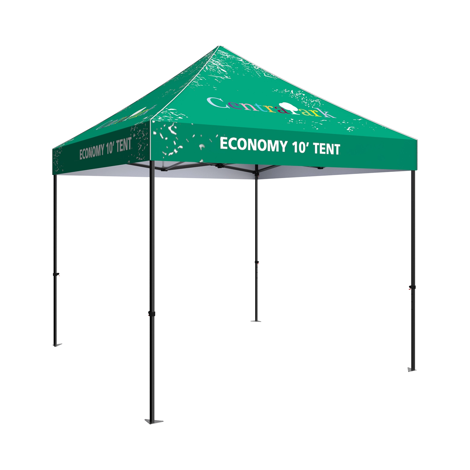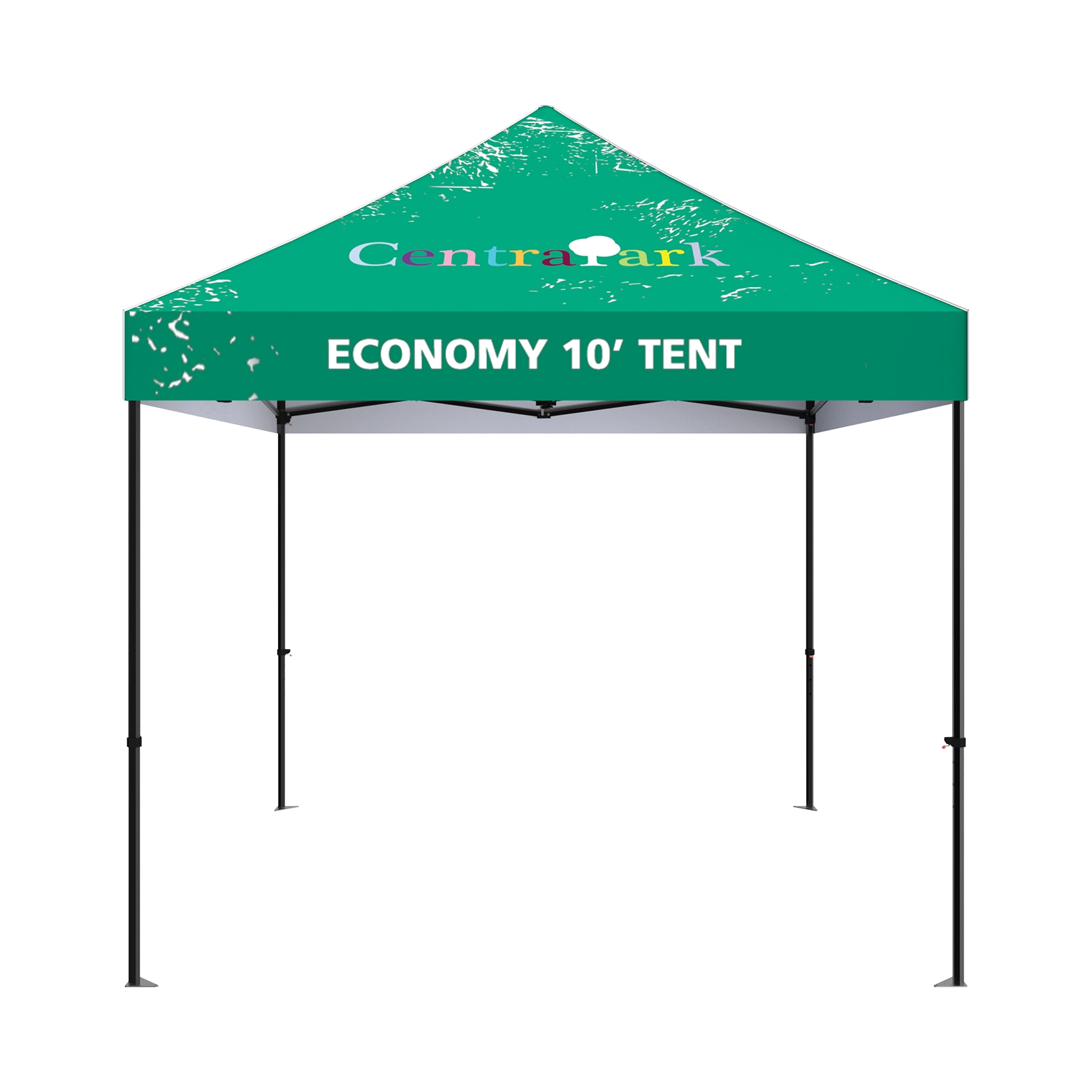 Strong and stable, the 10ft Economy Popup tent features a square steel frame, making it an ideal display at any outdoor event. Stock and custom-printed graphics are UV and water-resistant, designed to withstand the elements. The 10ft Economy tent shades and protects up to five people. Long-lasting half wall and full wall options are sold separately. Strong and stable, 10ft Economy Popup tent features a square steel frame, making it an ideal display at any outdoor event. Stock and custom-printed graphics are UV and water-resistant, designed to withstand the elements. The 10ft Economy tent shades and protects up to five people. Long-lasting half wall and full wall options are sold separately.- Opens to base size of 9.8’W x 9.8’D